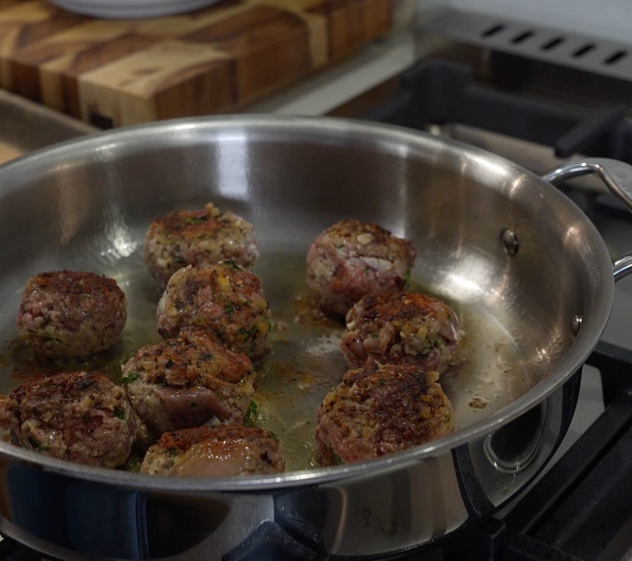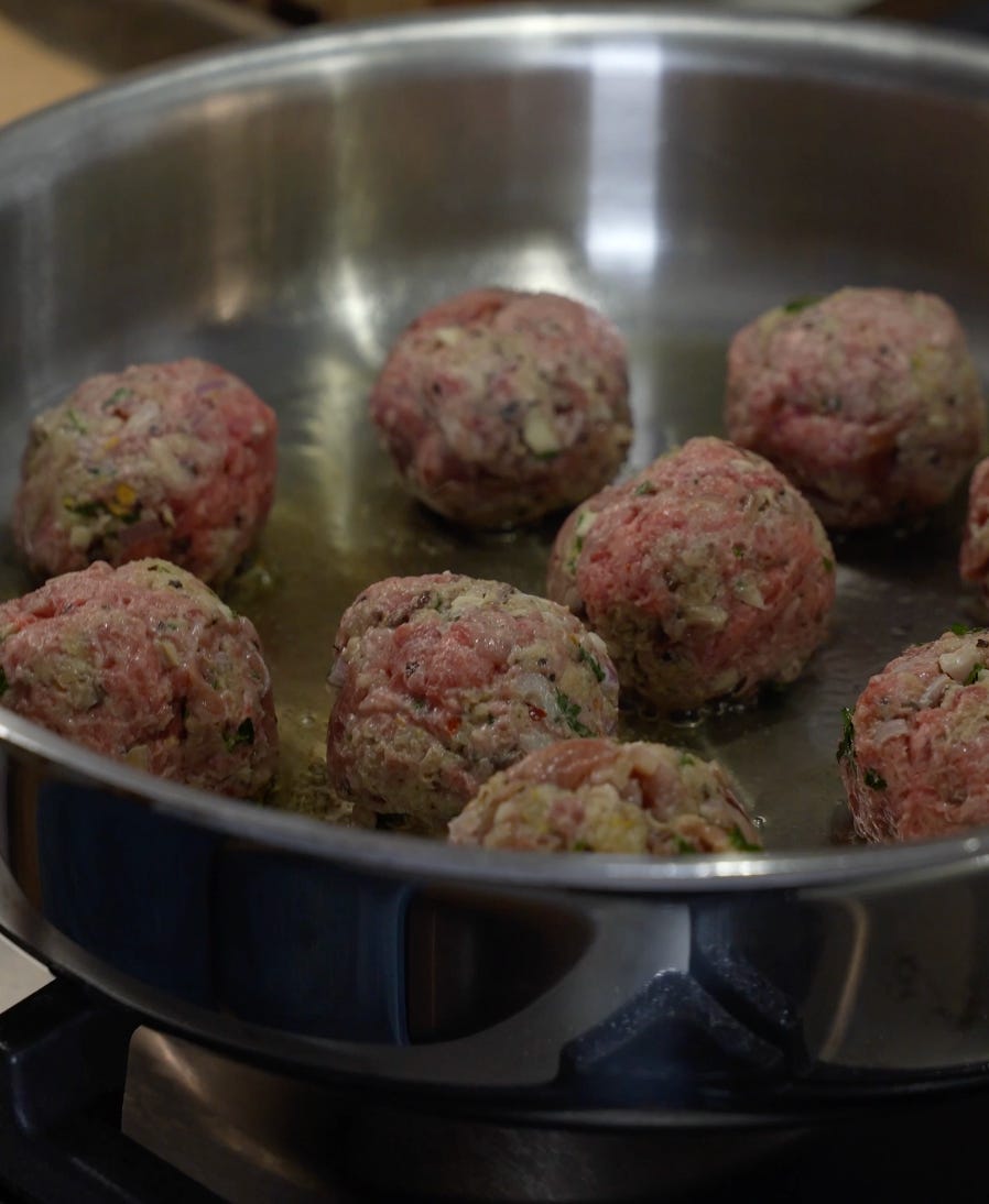 Heat avocado oil in a large skillet over high heat and sear meatballs for a few seconds on each side — just enough to brown, not cook through. Set aside.