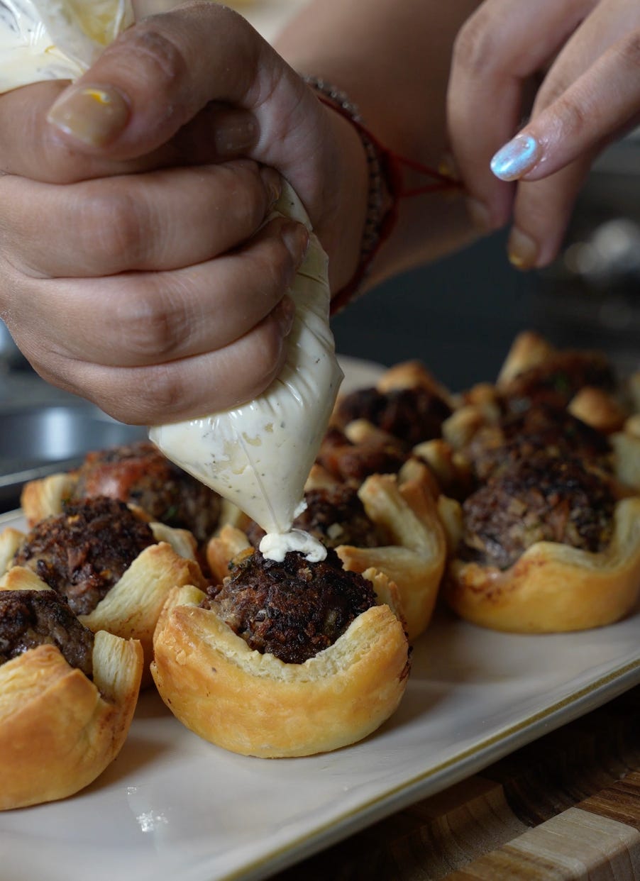 The most filling meal in the perfect bite. Soft dough holds an infamous Meatball Wellington enriched with bold flavors. Topped with a kicking Dijon-Boursin to enhance the bite.